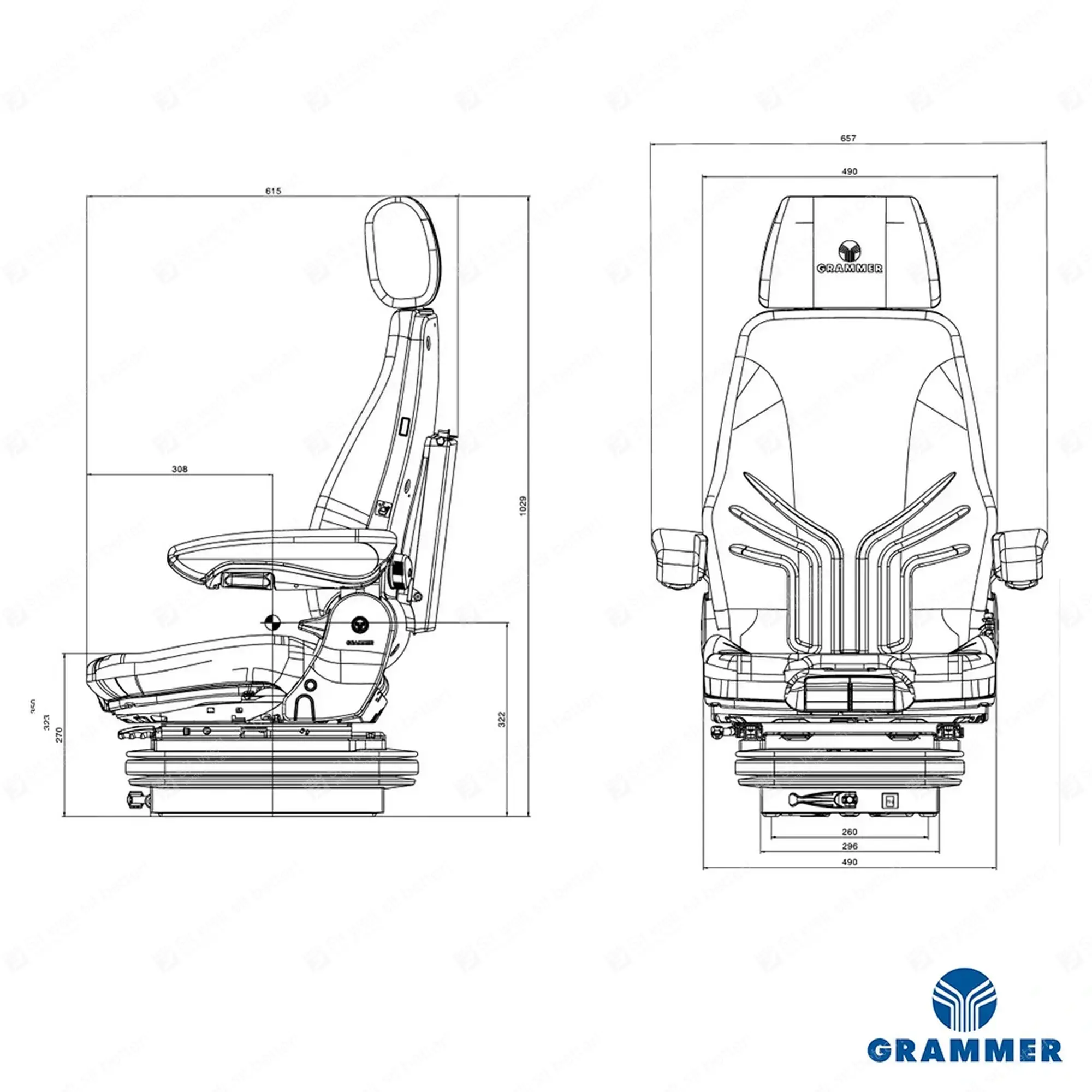 Optioneel is de Grammer Actimo M uit te breiden met een zijwaartse horizontaalvering, armleuningen, hoofdsteun, rolgordel en verwarming.