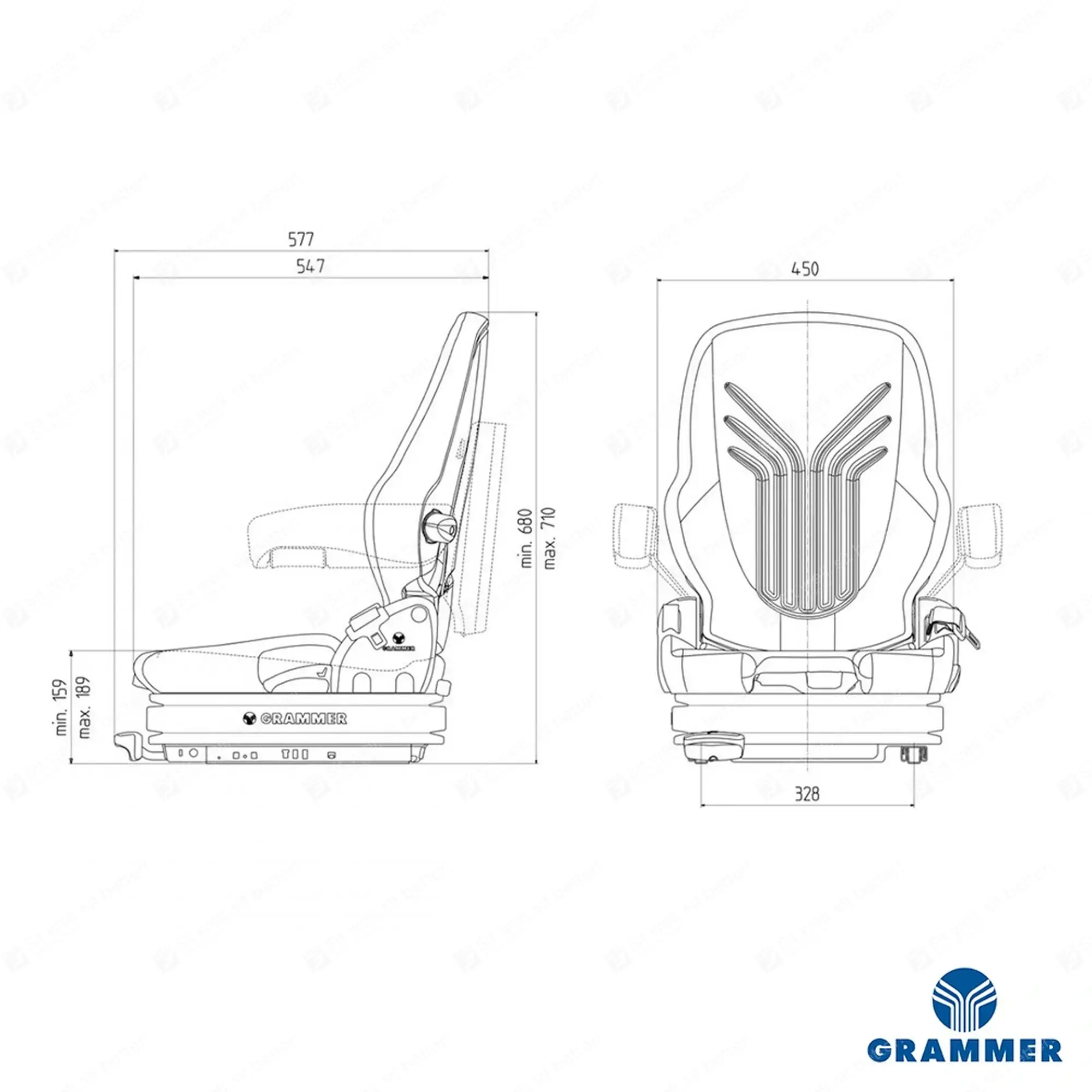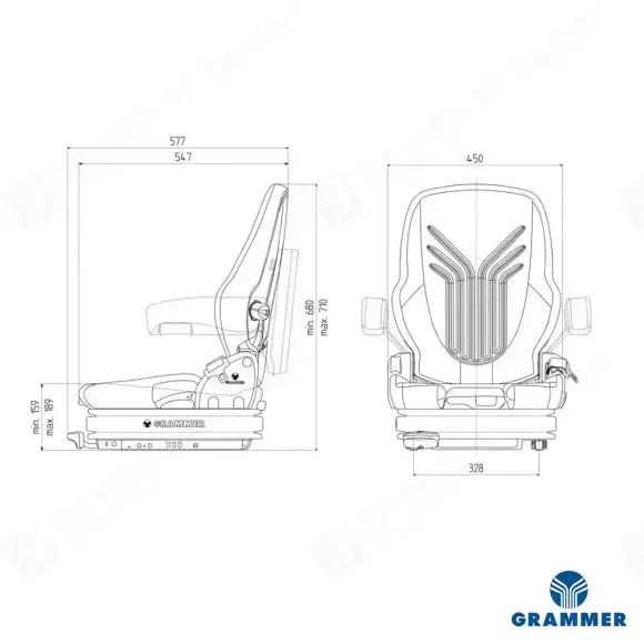 De Grammer stoel Primo XXL (Fabrikantennummer 1293476) heeft een laag frequentie vering en voldoet aan de ISO 6683 norm voor bouwmachines. Deze bouwmachinestoel is ook geschikt als heftruckstoel.