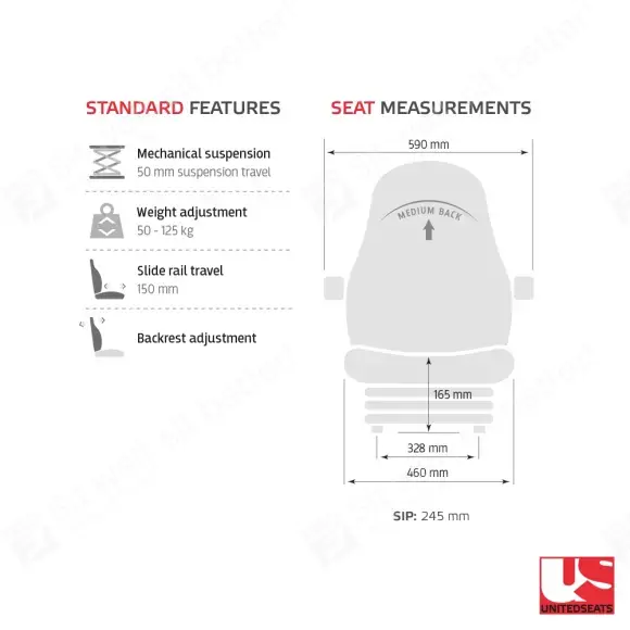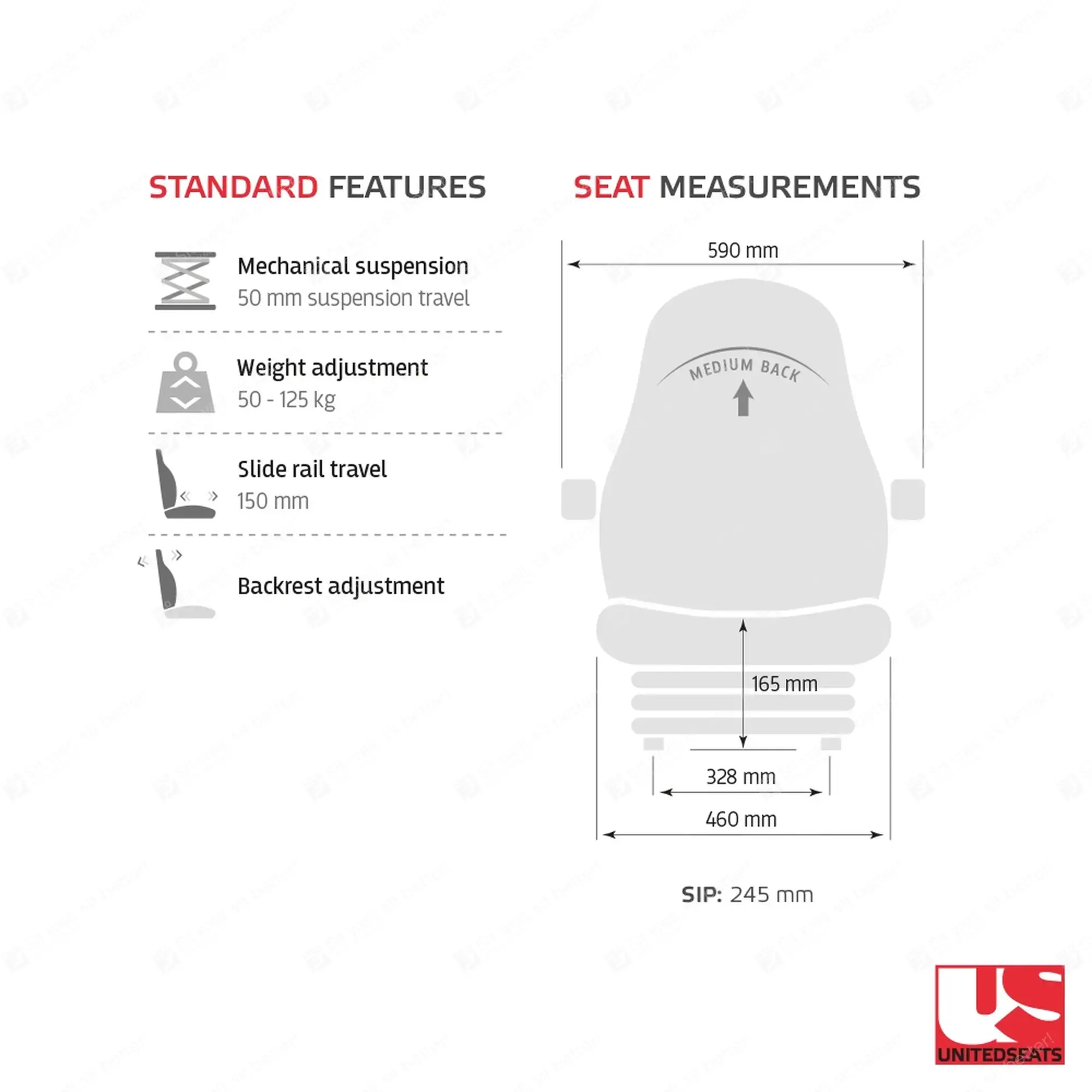 Standaard voorzien van verstelbare rug, 2-polige contactschakelaar en veerweg 150 mm. De stoel heeft een zitbreedte van 46 cm en een zithoogte van 20 cm. De handmatige gewichtsinstelling 50-125 kg is eenvoudig te bedienen met een knop aan de voorkant van de stoel.