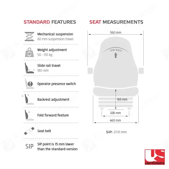 De UnitedSeats MGV35 stoel pvc lage SIP is een mechanisch geveerde stoel geschikt voor heftrucks en bouwmachines. De stoel is compact maar biedt mede dankzij de veerweg van 50-80 mm veel zitcomfort.